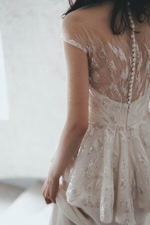 国内ブランドのドレスはレンタル仕様で、幅広い体型の方に合わせてサイズ調整が可能な、編み上げのデザインが多く、縫製上合わせやすいビスチェタイプが主流に。最近は高画質なスマホの写真や動画が主流になったこともあり、顔まわりのデコルテや肩周り、背中のデザインにもこだわる花嫁が増えています。背中のデザインの邪魔をしないファスナー仕様が一般的になりつつあり、煌めきのビーズ刺繍によるイリュージョンネックや動いた時に美しく見えるベルスリーブ、ボリュームのあるスリーブなど、上半身のデザインにも注目が集まっています。