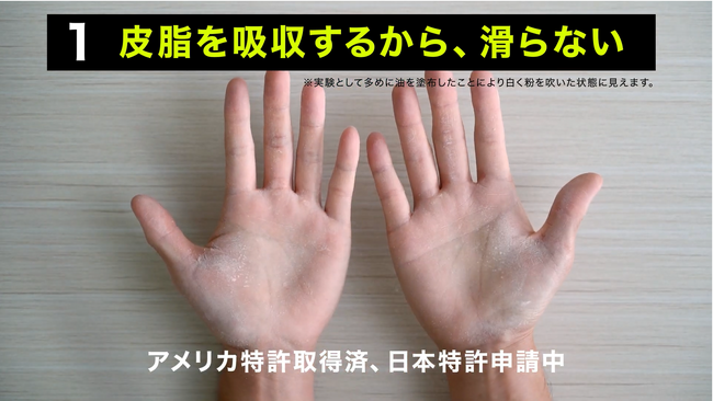 「チョークレス」は手汗滑りの根本原因である皮脂を取り除き、汗などの水分を弾く全く新しいタイプの滑り止めです。さらに原料はシリカ100%であり誰でも安全に安心して使うことが出来ます。