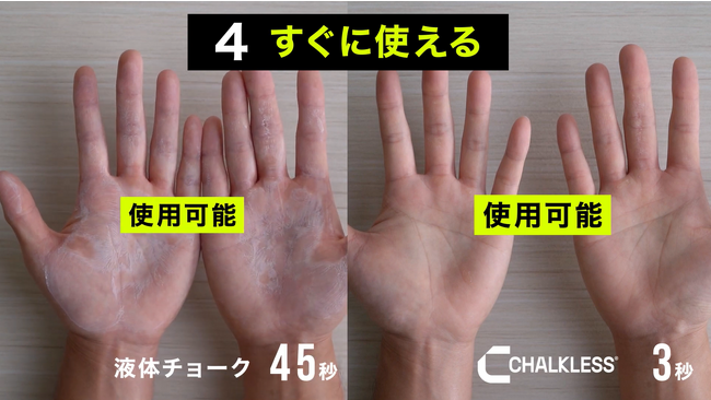 手につけた瞬間から効果を発揮できるのも特徴の1つ。液体チョークのように乾くまで、待つ必要がありません。チョークレスは手につけた瞬間から効果を最大限発揮します。