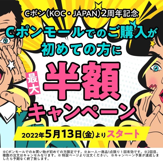 いつでも20%OFFで使えるクーポン決済サービス『Cポン』を運営する株式会社KOC・JAPAN(本社:東京都中央区銀座6-16-3 東京真珠ビル4階、代表取締役:清水 淳司、以下 KOC)は、Cポンモール初回半額キャンペーンを開始します。