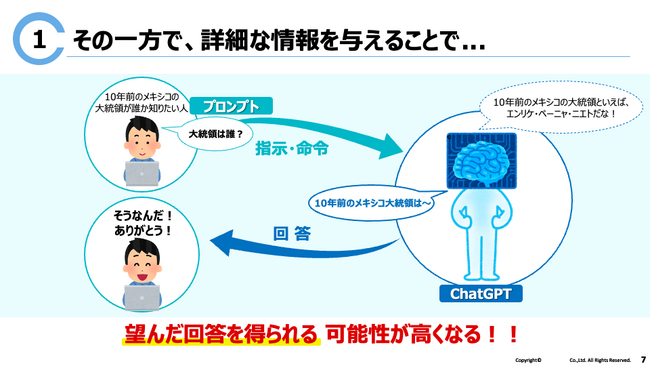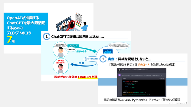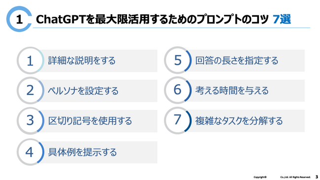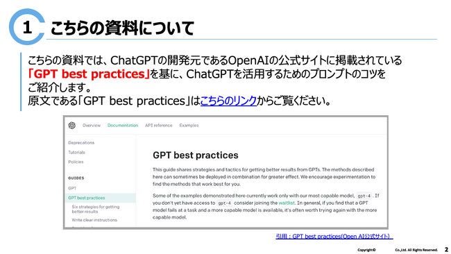 こちらの資料では、ChatGPTの開発元であるOpenAIが公開した「GPT best practices」を基に、ChatGPTを活用するためのプロンプトのコツを7つご紹介しています。[画像4: https://prtimes.jp/i/72906/14/resize/d72906-14-2ad0df4455f65bc95cac-2.png ]