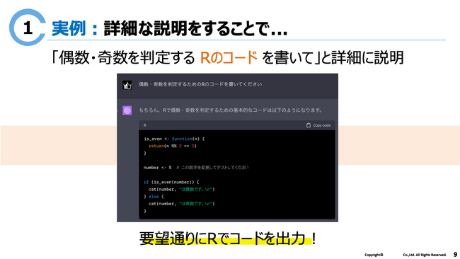 その一方で、具体的に「偶数・奇数を判定するRのコードを書いて」と指示すれば、ChatGPTは要望通りのR言語のコードをきちんと出力してくれます。