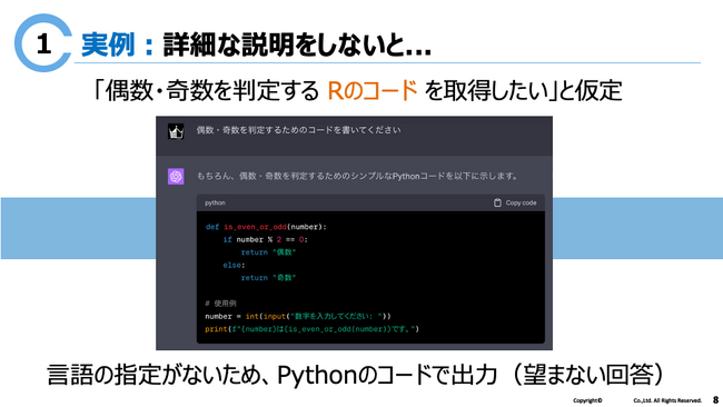 その際に、言語の指定をせずに「偶数・奇数を判定するコードが欲しい」とだけ伝えた場合、ChatGPTは自身でプログラミング言語を選択します。その結果、Rのコードを期待していたのにも関わらず、Pythonのコードが出力されるといったことが生じてしまいます。