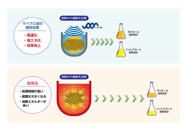 今回、マイクロ波化学の有するマイクロ波プラスチック分解技術”PlaWaveTM”を用いることで、軟質ポリウレタンフォームを分解する過程において、従来技術よりも消費エネルギーの大幅な低減や2倍以上の分解速度向上が期待できます。効率化により低コスト、かつ使用するエネルギーを再生可能エネルギー由来の電気にすることができるため、CO2排出量の削減にも貢献できます。