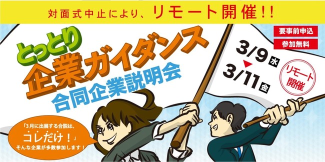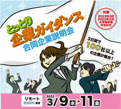 鳥取労働局(ハローワーク)・鳥取県・(公財)ふるさと鳥取県定住機構は、主に来春大学等卒業予定の学生に対し、企業が採用計画等の説明をする合同企業説明会「とっとり企業ガイダンス」を2022年3月9〜11日の3日間、オンラインにて開催いたします。
