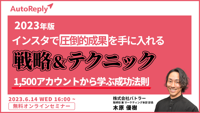 ”成果が実感できるInstagram施策”の「AutoReply(オートリプライ)」を提供する株式会社バトラー(本社:東京都中央区、代表取締役CEO:木下賢治)は、株式会社アイドマ・ホールディングス(本社:東京都豊島区、代表取締役:三浦 陽平)の子会社である、株式会社マーケメディアが主催し、2023年6/12(月)〜16(金)の5日間開催されるオンラインセミナーイベント「第10回メディアレーダーWEEK 2023夏」に登壇します。