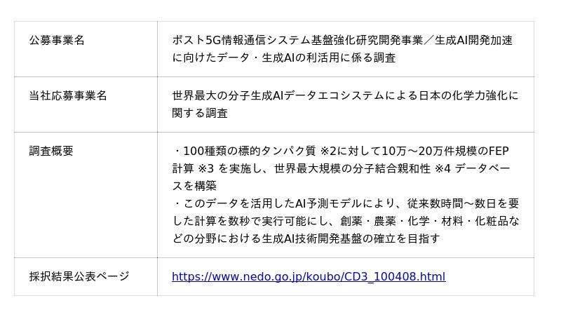 本調査事業では、現行世界最大の約10倍・10万〜20万件規模のデータベース構築と、AIによる3万〜10万倍の計算高速化(数時間〜数日→数秒)を同時に実現し、新薬・農薬・化学製品におけるコンピューターシミュレーションを用いた開発を飛躍的に加速します。製薬・農薬・化学業界を代表する国内トップ企業8社が協力し、日本発の世界最大級データ基盤で化学産業の国際競争力強化を目指します。