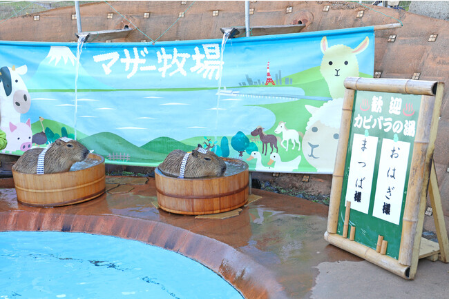マザー牧場では、カピバラたちがのんびりと温泉を楽しむイベント「カピバラ温泉」を連日好評開催中です。