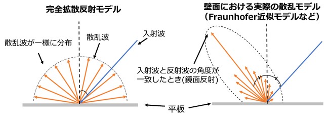 上記技術では電波の散乱を全方向に対して一様に散乱する完全拡散反射モデルが使われおり(図1)、実際の環境が再現されたサイバー空間上において面的な広がりを持った無線通信エリア推定を超高速に行うことを可能にしました。しかし、次世代移動通信(6G)のなかで検討が進められている場所・時・人に合わせた端末個々に対して所望の品質を確保するための柔軟なネットワーク制御を行うには、高速性を維持したまま場所固有の無線通信品質推定を高い精度で実現することが求められます。そのためには、実際の環境における電波の散乱について、図1に示す通り壁面などに入射する角と出射する角の関係性を伝搬QUBOモデルに取り込む必要がありました。