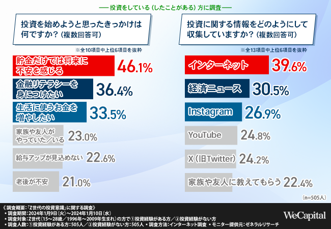 Z世代の投資経験者が情報収集に利用しているのは『インターネット』『経済ニュース』『Instagram』