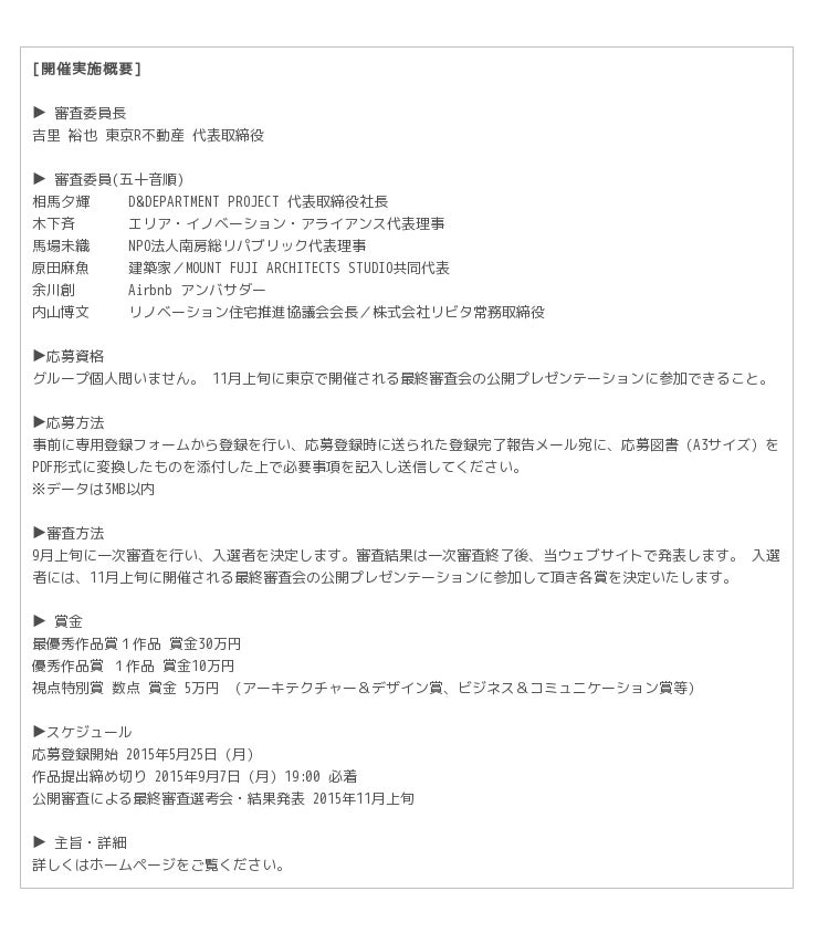 一次審査で入選された作品は、9月〜11月に全国各地で順次開催される「リノベーションEXPO JAPAN 2015」で展示された後に、11月上旬の公開プレゼンテーションを経て、上記審査委員による最終審査を行います。(各地域の「リノベーションEXPO JAPAN 2015」展に関する詳細情報は、後日ホームページ上で公開いたします。)