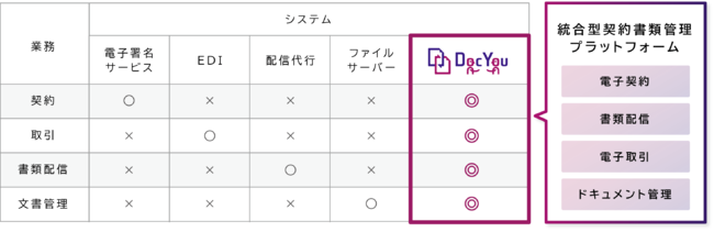 企業・行政機関・各種法人などの取引における多様な書類を統合的に管理できるクラウドサービスです。書類の配信、双方向で合意内容の調整を可能とする電子取引、DocYou以外の書類の保管まで、トータルに実現できる統合型の会社間取引書類管理プラットフォームです。