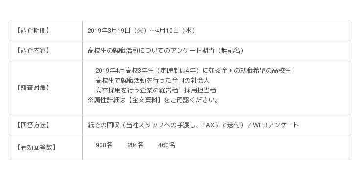 そこで今回当社では、より実態を把握すべく、就職を希望する高校生、高校で就職活動をした社会人、そして高卒採用を行う企業へのアンケートを実施いたしました。