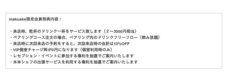 内 容:シェフおまかせコース 12品(22,000円・税込)を軸にmakuake会員限定で特典をリターンに