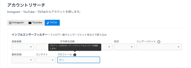 A streamのアカウントリサーチ機能を用いることで、必要なインフルエンサーをフィルターをかけて検索可能です。