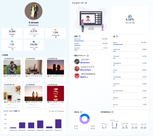 「A stream」は、2022年1月に正式ローンチ後、1ヶ月で70以上の代理店様およびメーカー様にご利用頂いております。現在期間限定で無料のトライアルアカウントを発行中です。サイコグラフィック分析によってデータドリブンのインフルエンサ―マーケティングを実現します。
