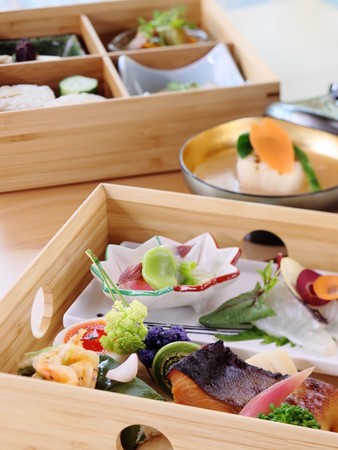 この春の結一「春のSHOKADO」は、季節の食材に拘る和食ならでは。鯛のお造りや蛍烏賊に、グリーンピースやホワイトアスパラガス、筍や桜海老のかき揚げに春らしい花びら百合根を舞わせるなど、春の息吹を五感で体験していただける松花堂弁当をご用意いたしました。