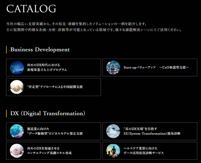 今回の「CATALOG」では、そのような課題感に対して、主に短期間で的確な企画・分析・評価等が可能となるサービスを紹介しております。多様な業界・テーマのコンサルティング経験のある、当社独自のアプローチとなっており、様々な課題解決シーンにてご活用頂けます。