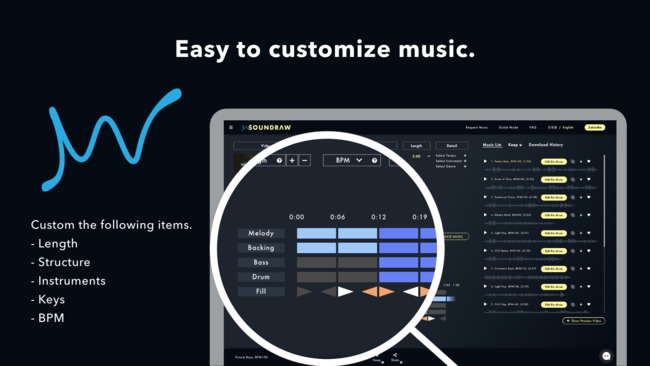 AIによって無数に生み出されるフレーズを組み合わせ、楽曲の尺・構成・楽器・テンポなどを自由にカスタムでき、会社PR動画、広告動画、YouTubeなど様々なコンテンツに合うロイヤリティーフリーの楽曲を簡単に作ることができます。