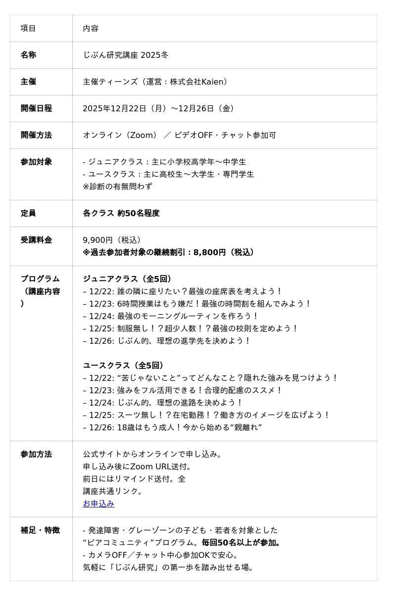 株式会社Kaienが運営する、発達障害やグレーゾーンの10代に特化した放課後等デイサービス「ティーンズ」は、冬期特別プログラム「じぶん研究講座 2025冬」を、12月22日〜26日にオンラインで開催します。講座では、仲間と話しながら学校生活や進路など、自分らしい学びや将来の理想を考え、自分自身で設計する機会を提供します。参加申込受付中です。