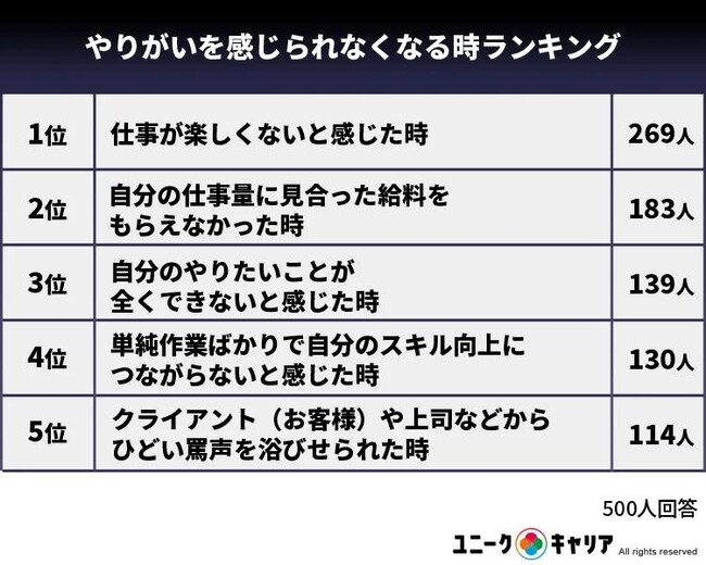1位は「仕事が楽しくないと感じた時」で269人だった。