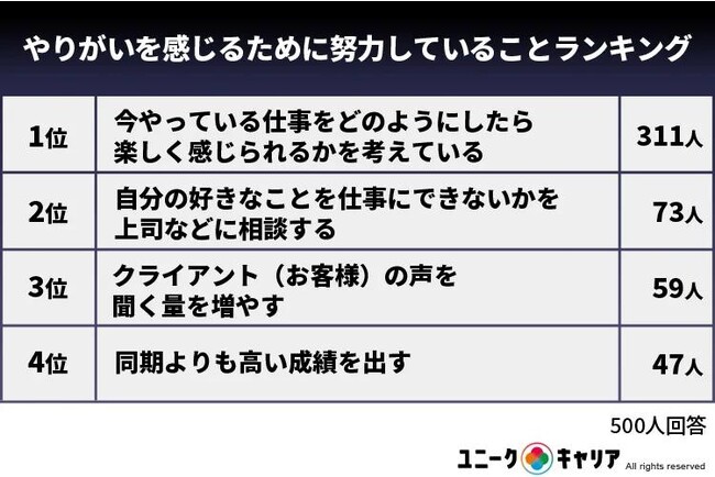 やりがいを感じるために努力していることを500人に訊いたところ、次のような結果になった。