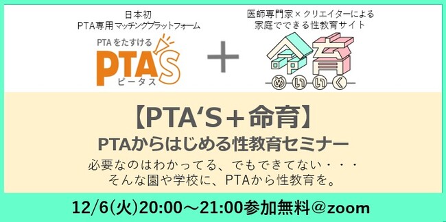 日本初のPTA専用マッチングプラットフォーム「PTA’S(ピータス)」を運営する合同会社さかせる(本社:神奈川県川崎市、代表社員:増島佐和子)は、性教育サイト「命育(R)」(ヨミ:めいいく|Siblings合同会社運営、本社:東京都世田谷区、代表:宮原由紀)協力のもと、12月6日(火)にPTA向け性教育セミナーを開催いたします。