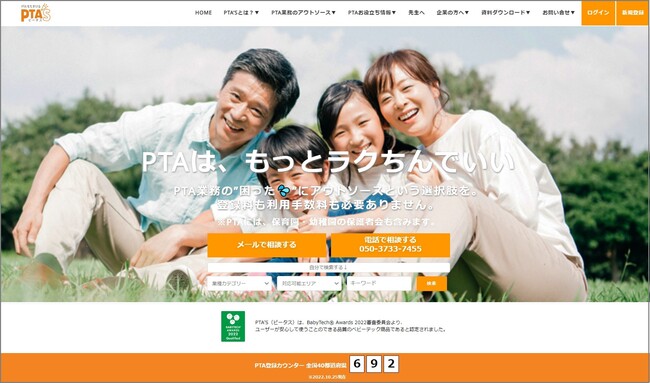 PTA業務のアウトソースサポートを主軸に、PTAの効率化・適正化・安定化と、保護者の負担軽減を、様々な角度から推進しています。誰もが前向きな気持ちで参加しやすいPTAを実現することで、家族の時間の最大化を目的としています。全国の、保育園・幼稚園の保護者会、小・中・高・特別支援学校のPTAを対象とし、2022年10月時点で、40都道府県約690のPTAが登録・活用しています。