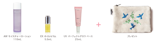 (AW モイスチャーローション 110mL、EX オイルセラム 5.5mL、UVパーフェクトグロウベース 25mL、オリジナルポーチ)