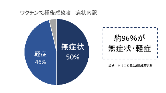 しかし、ワクチン接種が進む中、東京では8月1日の新型コロナ感染者数が3,058名となるなど、全国的に感染が急拡大しています。ワクチン接種後の感染も確認されており、ワクチン接種後の感染においては、無症状が50%、軽傷が46%、中等症が4%となっております。(注1)