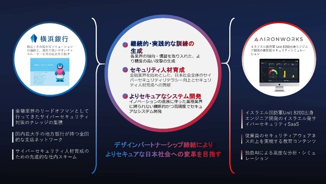 イスラエル発サイバーセキュリティSaaS提供のAironWorks株式会社 (本社:東京都港区、代表取締役:寺田 彼日、以下「AironWorks」) は、株式会社横浜銀行(本社:神奈川県横浜市、代表取締役頭取:大矢 恭好、以下「横浜銀行」)と、世界最高水準のサイバーセキュリティシミュレーション教育プラットフォームの共同デザインを始動するため、相互にデザインパートナーシップを締結しました。AironWorksは近年増加中の標的型攻撃対策強化を目的としたより精度の高いシステム開発、横浜銀行は顧客体験の革新、サイバー攻撃対策強化及び社内人材育成・リテラシー向上、金融業界全体のセキュリティレベルの底上げを目的に、本パートナーシップの締結に至りました。