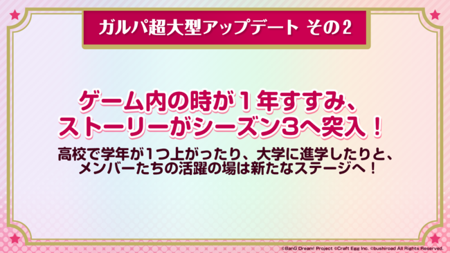 ゲーム内の時が1年進み、ストーリーがシーズン3へ突入いたします。高校で学年が1つ上がったり、大学に進学したりと、メンバーたちの活躍の場が新たなステージに変わります。高校の卒業、そして進級に向けての彼女たちのストーリーも、6周年までの1年をかけてお届けしていく予定です。