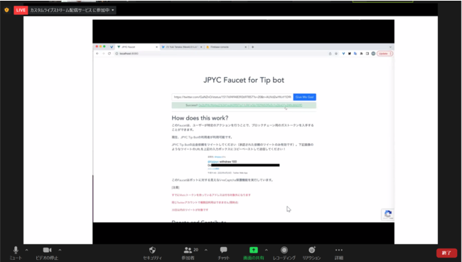 未練ジャーズは、スローガン「公共財を作ろう!」のもと、ブロックチェーンのアプリケーション利用において、地味で資金調達がしにくい分野でありながらも重要なインフラ部分に注目。JPYC利用時のネットワーク手数料を入手するための「Faucet(フォーセット)」のデモを披露しました。
