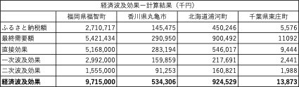 ふるさと納税制度を要因として発生した経済活動は、1.個人から自治体への寄付、2.自治体から寄付者への返礼、3.寄付を受けた自治体による寄付金使途です。よって「ふるさと納税額」の2倍が「最終需要額」となっています。「直接効果」は国内自給率などで換算した数位、これに一次波及と二次波及を加えて、経済波及効果といます。