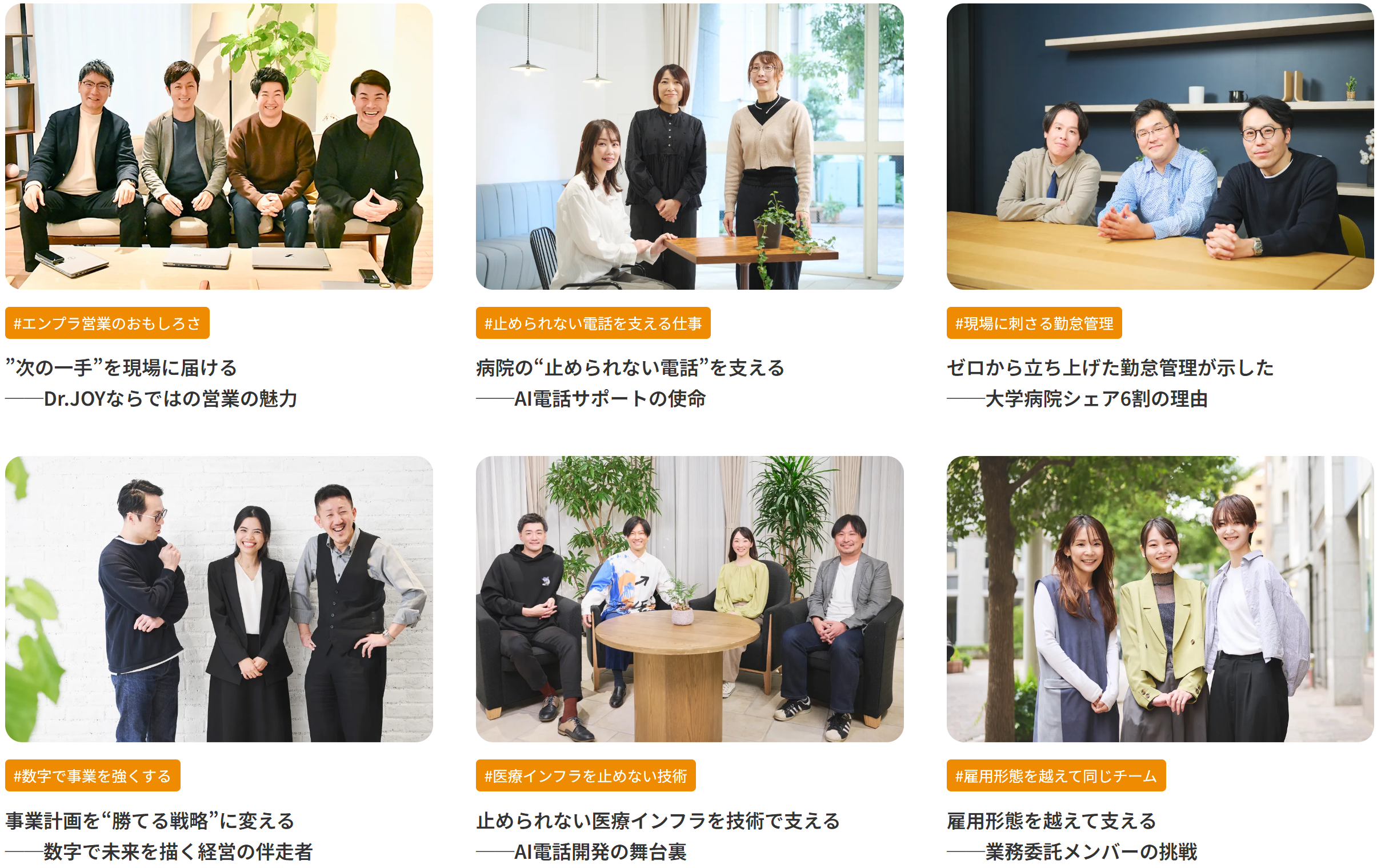- 社員を全面に出したコンテンツを一挙公開:社員やチーム紹介、座談会・インタビュー、働く風景など、求職者が知りたい情報を職種別により早く深く取得できるコンテンツを拡充- Dr.JOYの軌跡動画を掲載:創業時からの想いとDr.JOYの原点、医療現場の課題に向き合う原動力を、代表・石松や社員が自ら語る動画を公開