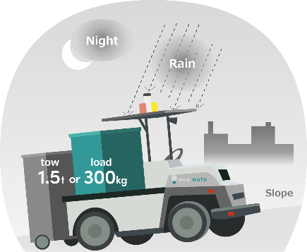 eve autonomyは工場や物流施設向けに、主に屋外における事前の設備工事を必要とせずに自動搬送システムの導入を実現するソリューション「eve auto(R)」を提供しております。屋外環境においては、段差や坂道などの路面環境に加え、雨や日照の天候条件など、屋内より厳しい環境での運用が求められます。eve auto(R)は、高い信頼性により全国で活用されているEVカートと、一般公道においても活用される最先端の自動運転技術を活用し、雨天や夜間でも工場等の敷地内屋外環境で自動運転レベル4での無人搬送運用を実現しているため、24時間稼働が求められる施設での運用も可能です。