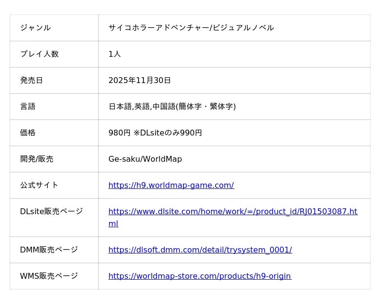 株式会社トライシステムの運営するゲームレーベル「WorldMap」は、サイコホラーアドベンチャー「H9:ORIGIN」を本日11月30日 (日) 0:00(JST)に販売価格980円(ローンチセール実施中)で販売開始しました。