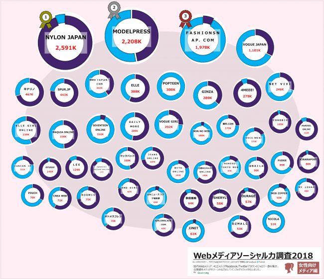 メディアの名前を縁取る2色の円グラフは各SNSのフォロワー数の割合を示しています。