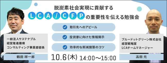 当社の子会社で環境経営支援サービスを提供するブルードットグリーン株式会社(以下「ブルードットグリーン」)は、一般社団法人サステナブル経営推進機構 コンサルティング事業部長の鶴田祥一郎氏をお招きし、2022年10月6日(木)14:00からオンラインにて「脱炭素社会実現に貢献するLCA/CFPの重要性を伝える勉強会」を開催します。