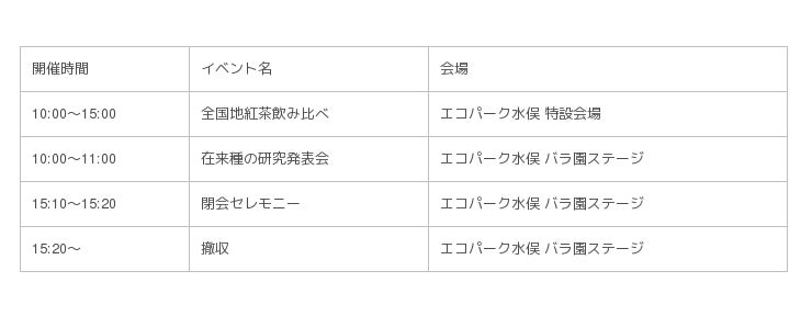 全国の地紅茶を楽しめる試飲会や、地紅茶生産者向けの生産技術や販路拡大セミナー等、同会場内で実施するバラの祭典「水俣ローズフェスタ秋」に合わせたバラエティー溢れるイベントを実施します。