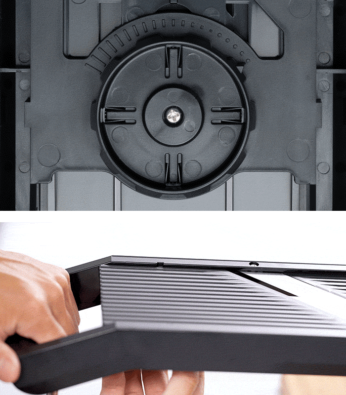 本体裏面のダイヤルを回すことで、本体の可動天板が上下しスライス厚を変更できます。