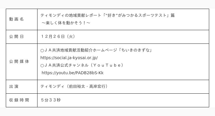 Webムービー「ティモンディの地域貢献レポート『“好き”がみつかるスポーツテスト』篇〜楽しく体を動かそう!〜」をJA共済地域貢献活動ホームページおよびYouTubeのJA共済公式チャンネルにて公開しました。