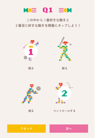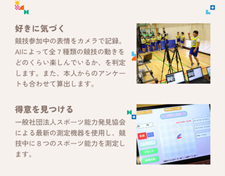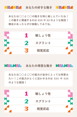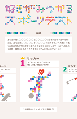 2.学校で実施した体力測定の結果をWebサイト内に入力し、簡単な質問に答えるだけで、「得意な動き」と「好きな動き」を診断。診断結果をもとに、自分自身も気づいていない、「“好き”になるかもしれない」スポーツを提案します。