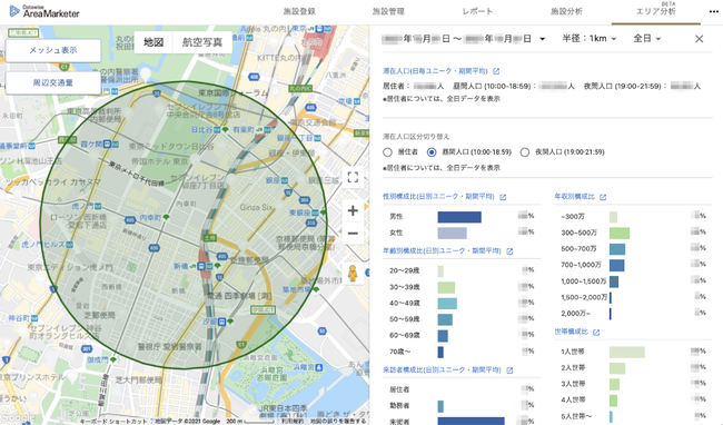 株式会社NTTドコモ(以下「ドコモ」)の協力のもと開発された、ドコモGPS統計データおよび属性・アンケート情報を活用した人流分析ツールです。エリアや施設の周辺人口、来訪者数をその属性(性別、年代、世帯構成、等)と併せ把握いただくことで、街づくり・観光・交通量調査・防災等、様々な用途にご活用いただけます。
