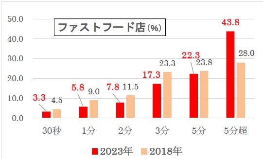 注文すればすぐに出てくるというのがファストフード店のイメージですが、結果は、「5分超」が43.8%でトップ。次いで「5分」(22.3%)でした。