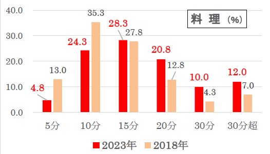 ランチタイムで料理が運ばれるまでの時間は「15分」(28.3%)がトップ、次いで「10分」(24.3%)でした。 “15分まで”(※)に6割近く(57.4%)がイライラしはじめますが、18年調査と比べ「20分」以上の各時間が増えており、こちらも気長になっているようです。