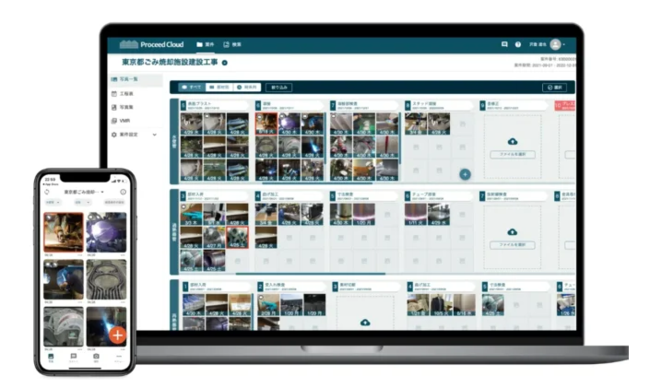 「Proceedクラウド」は工程写真を基に製造情報データベースを構築することで、分散していた生産情報を集約し、製造状況の可視化を行うサービスです。モバイル端末での写真整理・保存機能、写真一覧画面への工程情報の表示機能、写真への書込み機能などにより、業務効率化、遠隔での製作進捗状況の把握、技能継承の基になるデータベースの構築を実現いたします。