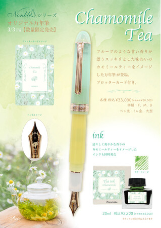 文具卸・店舗運営の株式会社エヌ・ビー・シー(本社東京都目黒区 / 代表取締役社長 丸山裕子、以下エヌ・ビー・シー)のオリジナルブランドNONBLEから、『紅茶』をテーマにした万年筆&インク第二弾が数量限定で登場。今作はカモミールティーをイメージした爽やかなデザインとなっています。3月3日(金)より、エヌ・ビー・シーの展開する全国13店舗と、オンラインストアにて発売いたします。