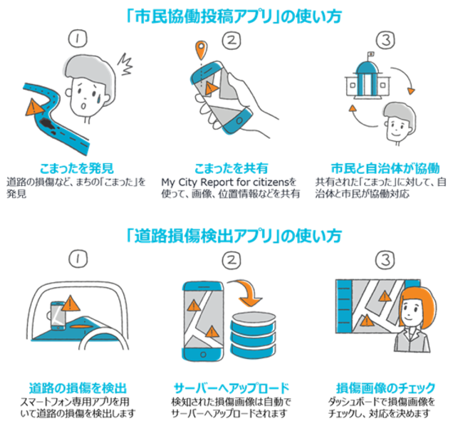 My City Reportは、住民自らスマートフォンにインストールした専用アプリにより、道路の損傷等の困った状況の画像と位置情報を投稿し、共有された困った状況を自治体と市民が協働して対応するための「市民協働投稿サービス(for citizens)」と、専用アプリをインストールしたスマートフォンを自動車のダッシュボードに設置しパトロールすることにより、アプリが自動的に道路の損傷箇所を検出し、損傷画像とその位置情報をサーバにアップロードする「道路損傷検出サービス(for roadmanagers)」を提供する自治体向けのサービスです。