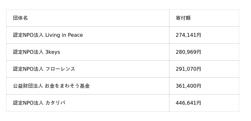 本プログラムの寄付先は日本において深刻化している子供、シングルマザー、教育問題の解決に取り組んでいる認定NPO法人などの団体が対象です。2025年は、前年同様に社会貢献ポイントプログラムに5団体が参加、それぞれの団体に以下の寄付が行われました。